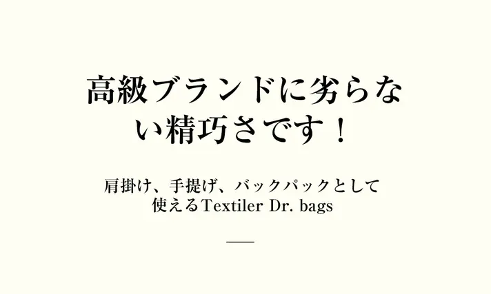 Textiler Dr. bags は厳選した高品質オイルワックスレザーを採用。お手入れがしやすく、日本の気候でも安心してご使用いただけます。