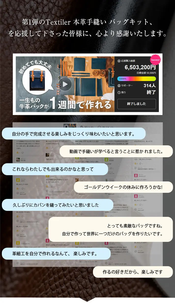 第1世代の製品プロセスで、サポーターの皆様からの貴重なご意見や、フィードバックを元に、第2世代の「Textiler Dr. bags 極品ドクターレザークラフトキット」では、革の厚さや部品の精密な計算、デザインに特にこだわりました。あなたが最初の一歩を踏み出すだけで、あとは私たちに安心してお任せください!