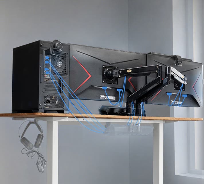 幅広の天板と配線整理トレーを備え、複数モニターやPC機器もスマートに設置可能。