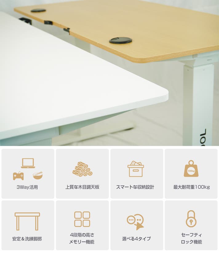 - スマートデュアルモーター搭載。滑らかで安定した昇降を実現!最大耐荷重は約100kgの安心設計。